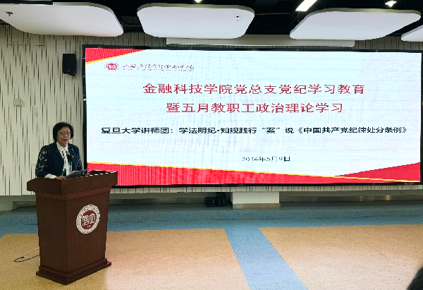 5月9日下午,金融科技学院邀请复旦大学博士生讲师团(简称博讲团)来访作“学法明纪·知规践行:'案'说《中国共产党纪律处分条例》宣讲报告暨教职工政治理论学习。博讲团指导教师(前团长)左宗正、现任分团长徐仁进、副团长邵晋涵、学院教师和学生党员参加了会议。会议由党总支书记凌慧义主持。