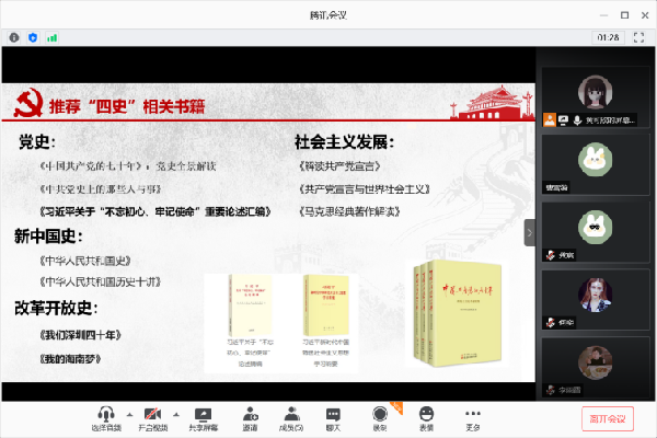 7月16日,团队组织开展“读四史,守初心,看巨变,展未来”线上特色读书会活动。团队成员依次介绍近期观看的“四史”书目,畅谈各自学习体会与阅读心得,黄可欣表示自己“深切感悟了到中国共产党走过的艰苦历程和光辉岁月、宝贵经验和伟大成就,以及中国共产党带领中国人民从站起、富起来到奔向强起来的巨大变化”;曹雪漪表示“要将初心和使命持续融入到学习和工作的各个环节,肩负起新时代青年的使命与担当”。