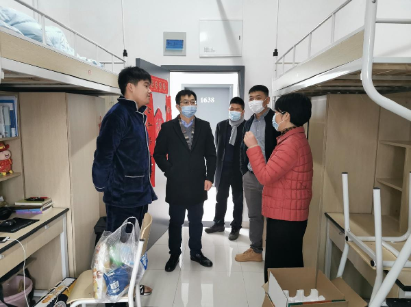 为配合防疫工作,响应“就地过年”号召,我院共有两名学生留校过年。2月11日大年除夕上午,金融科技学院副院长(主持行政工作)殷林森,副书记(主持党务工作)褚红素,副书记、副院长李俊杰、学院党政办公室黄文君、王志慧等领导、老师,前往学生宿舍看望慰问留校过年的学生,代表学院向他们送上新春祝福。