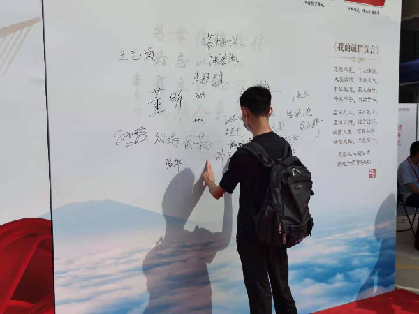 在迎新现场,新生辅导员张文鹏老师为同学们讲述校园诚信文化的积淀,呼吁诚信美德的继承与发扬。结合诚信教育,学院也准备了《信好有你》等书籍的展示,让刚进入立信的新生们也感受到诚信校园的氛围。同学们纷纷在诚信墙上签下名字,在心中庄重承诺。