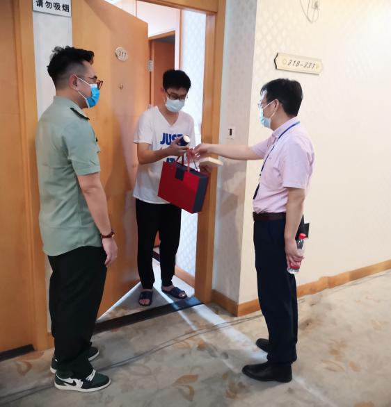 慰问中,王书记敲开隔离学生的房间门,仔细询问大家的身体状况、住宿条件、学习情况,详细了解学生隔离期间的实际困难和需求,叮嘱学生一定要做好自我防护,保持良好心态。王书记给学生们送上了诚挚的节日祝福并向同学赠送了学校定制的月饼、校友访谈书籍以及学院定制的“感谢守护立信”慰问品。隔离留观的同学们收到中秋月饼后纷纷表示,虽然隔离却仍能感受到“家”的温暖,身心都得到了极大的安慰,对学校老师和同学的暖心关怀表示感谢。他们表示,在隔离留观期间将积极配合工作,合理安排自己的学习。
