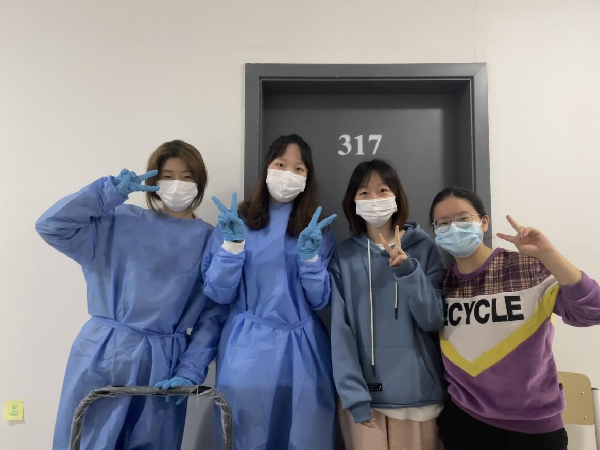孙布雨:在送餐时与志愿者的合影,志愿者们不辞辛苦为同学们服务,表示感激和敬佩!