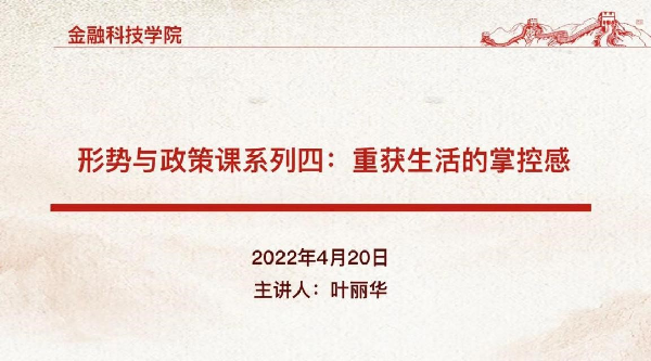4月20日下午,金融科技学院副院长叶丽华为金融科技学院全体学生骨干上了一堂以“重获生活的掌控感”为主题的形势与政策课,引导我们在疫情期间通过学习、锻炼来缓解自身的焦虑情绪,掌控生活的节奏。