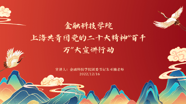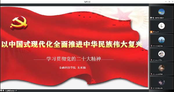 为深入学习宣传贯彻党的二十大精神,提升团员青年政治理论素养,近日,金融科技学院团委通过腾讯会议组织开展了上海共青团党的二十大精神“百千万”大宣讲行动。此次宣讲由金融科技学院团委书记朱亚楠老师主讲,各班团员青年积极参与。