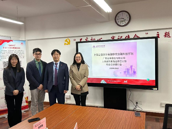 为深入贯彻落实党中央、国务院关于高校毕业生就业工作的决策部署和教育部“访企拓岗促就业”专项行动的通知要求,全力促进毕业生高质量就业,3月2日,广发证券股份有限公司上海浦东南路证券营业部李博龙、许思佳两位老师莅临我院参加校企交流研讨。学院党总支副书记、副院长(挂职干部)沈丹和菁才会客厅负责人张文鹏参加会议。