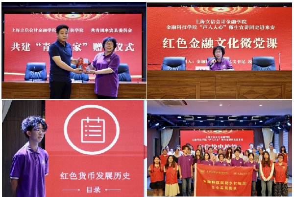 为纪念潘序伦先生诞辰130周年及建校95周年,促进红色金融文化传播,实践团队于7月20日在来安县新时代文明实践中心开展系列宣讲活动,并由凌慧义代表金融科技学院赠予共青团来安县委员会纪念书籍,立信会计出版社出版的《经世济民——中国现代会计之父潘序伦的家国情怀》。实践团队成员王萨迪同学宣讲了由中国工商银行上海市分行与我校共同举办的红色货币展内容——“红色货币史”,随后凌慧义宣讲“红色金融文化”微党课并详细介绍立信校史校情,讲述立信与来安县的渊源,在皖东大地弘扬立信精神与诚信文化。