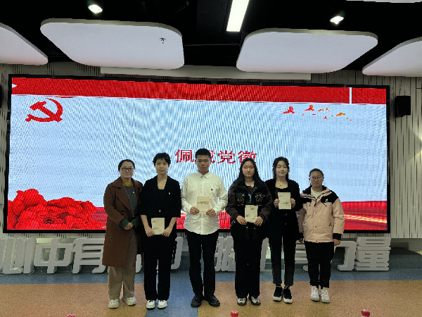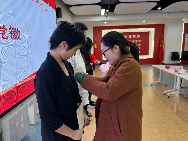 金融科技学院党总支组织委员陶敏宣读了经学校党委批准的新发展党员名单。党支部书记为新党员们佩戴党徽,并颁发《入党通知书》。