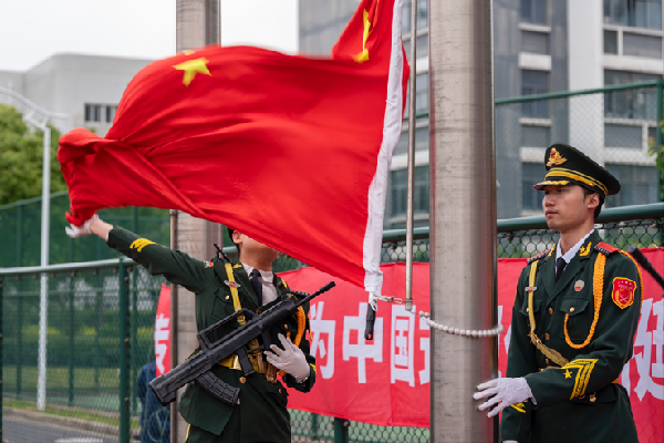 早晨7点30分,升旗仪式正式开始,国旗班迈着整齐有力的步伐来到国旗台下,伴着国歌的激昂旋律,五星红旗冉冉升起,全体师生在国旗下肃立,高唱国歌,向国旗行注目礼。