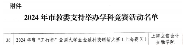 近日,上海市教育委员会发布《上海市教育委员会关于公布2024年支持举办学科竞赛活动名单的通知(沪教委高〔2024〕30号)》。由上海立信会计金融学院承办的“工行杯”全国大学生金融科技创新大赛(上海市赛)成功入选上海市《2024年市教委支持举办学科竞赛活动名单》。