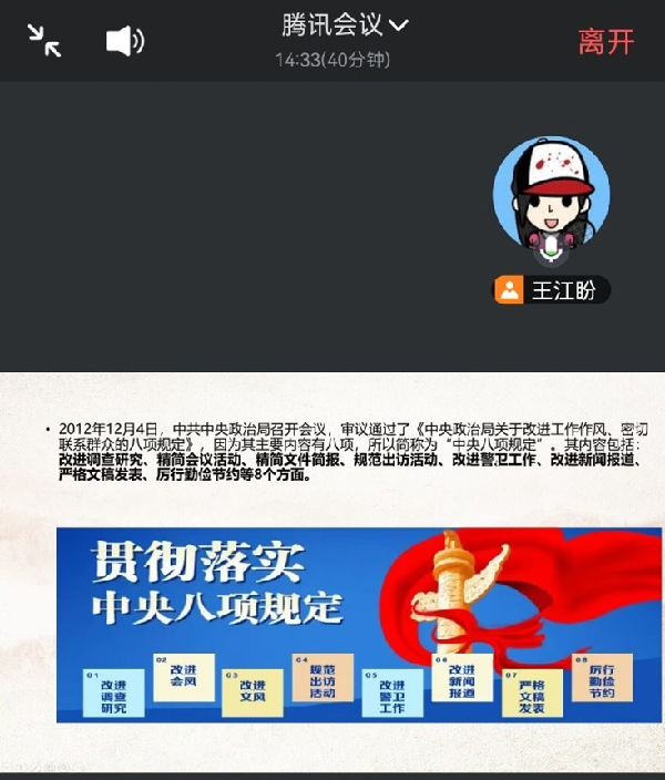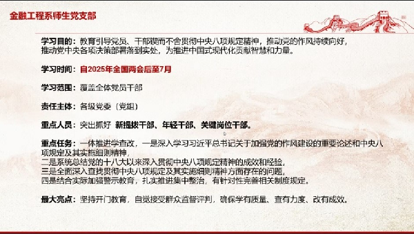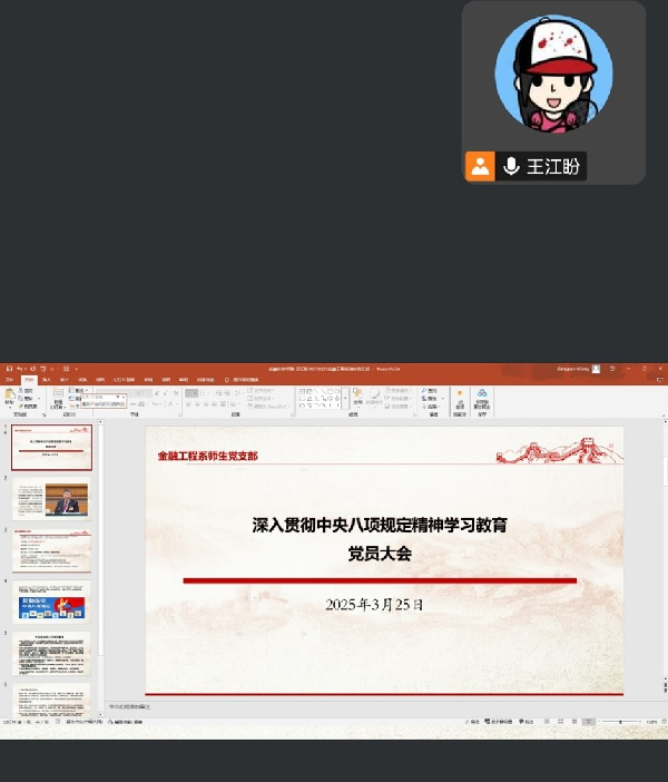 为深入贯彻习近平总书记关于加强党的作风建设的重要论述,落实党中央关于在全党开展“深入贯彻中央八项规定精神学习教育”的部署,金融工程系师生党支部于2025年3月25日下午在线上召开了党员大会,专题学习中央八项规定精神,进一步推动党的作风持续向好,确保党中央各项决策部署落到实处,本次会议由王江盼主持。