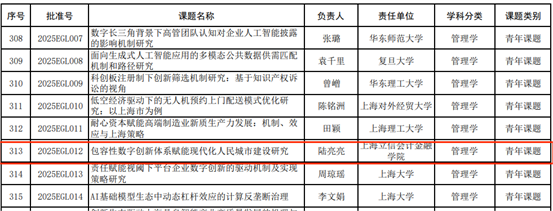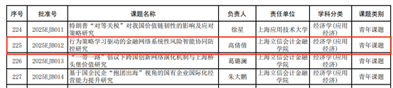 在2025年度上海市哲学社会科学规划课题申报中,学院再创佳绩,共获得3项立项,涵盖一般课题与青年课题,研究领域多元交叉。丁雪老师主持的一般课题《超大城市新能源充换电基础设施价值共创模式与实现路径研究》;高倩倩老师主持的青年课题《学习驱动的金融网络系统性风险智能协同防控研究》;陆亮亮老师主持的青年课题《包容性数字创新体系赋能现代化人民城市建设研究》。此次三项课题的同时获批,实现了我院在上海市哲学社会科学规划课题立项上的重要突破。无论在立项数量、课题类型还是学科交叉覆盖面上,均较往年取得显著进步,充分彰显了我院在哲学社会科学研究领域的创新潜力与整体实力,标志着我院科研工作迈上了新的台阶。
