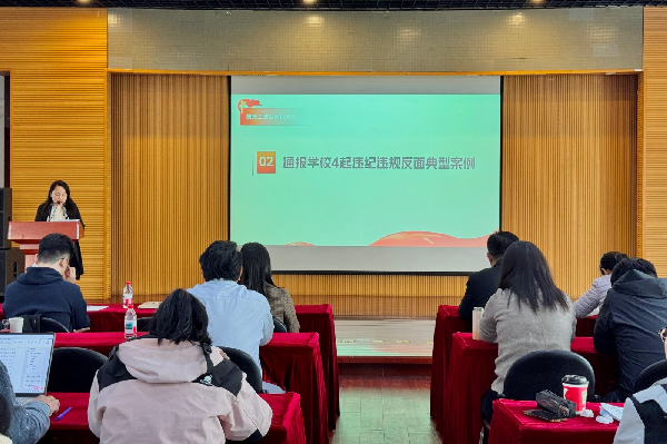 学院党总支副书记、副院长、纪检委员陈嵩莉围绕学校发生的4起违纪违法典型案例,开展案情通报与警示教育工作。