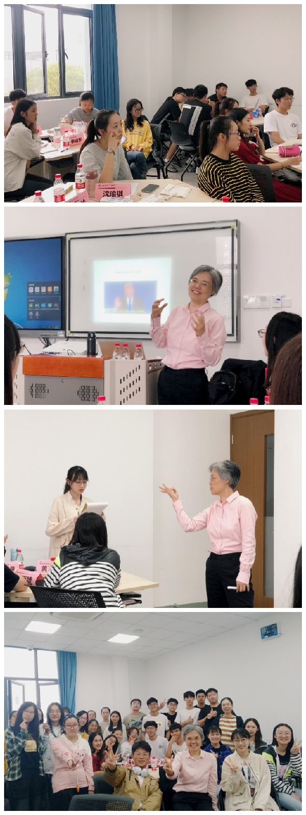 本次授课,通过小组讨论、两人互换故事、个人上台演讲等方式展开。叶慧琍老师用独具特色的讲课风格、丰富的人生阅历及国际视野带动同学融入课堂,促使学生积极参与,打破传统的教学模式,一改传统课堂的严肃面貌,魅力十足,吸引学生主动学习探究与展示。课上学生积极参与,紧跟专家授课节奏,主动上台展示,虚心接受专家意见。提问环节多名同学纷纷举手发问。本次专家授课反响热烈,骨干学生表示通过本次课程无论对演讲技巧还是为人之道,都有新的认识,对克服恐惧展示自我亮出金科学子风采具有极大帮助。