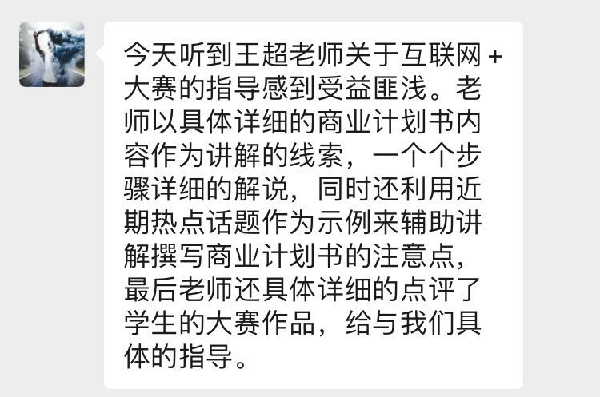 疫情没有阻挡同学们的参赛热情和对知识的渴求。第二次线上“互联网+”大学生创新创业大赛专家指导直播课,让参赛学生们受益匪浅,纷纷表示通过本次课程对商业计划书撰写有了更清晰地认识,对个人本次项目书的修改有很大帮助,后续阶段必定积极吸取专家建议,认真打磨商业计划书的内容,争取获得优异成绩。