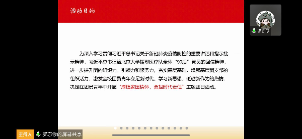 19级金融科技1班团支部在“云端”认真学习了习近平总书记的回信精神,并采用“青年大学习问答”的形式,巩固同学们对回信精神的学习效果。期间穿插了“以‘艺’抗‘疫’”,鉴赏同学们参加各种线上活动的文创作品。该团支部还通过此次团员大会进行“推优”,检验同学们学习、践行“厚植家国情怀,勇担时代责任”的思想成果。