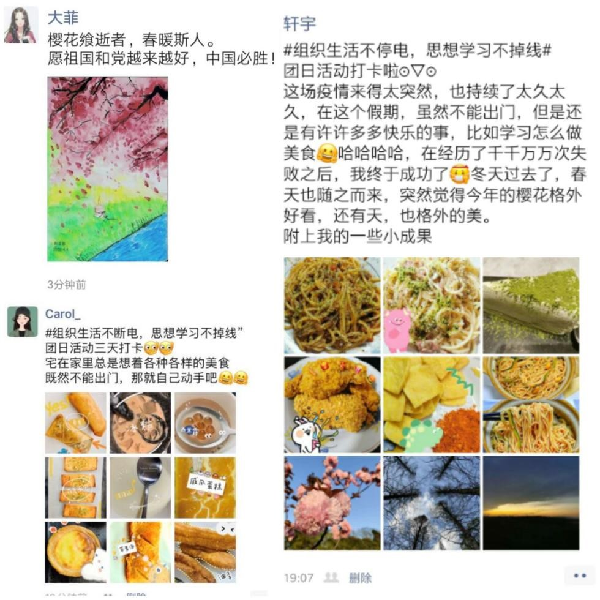 18级金融科技2班团支部通过发布“厚植家国情怀,勇担时代责任”主题问卷,全面了解同学们学习新思想、对家国情怀和青年担当的认知程度,并且通过拍摄同学们在疫情期间居家创作的文艺作品和对前线医护人员志愿者加油鼓劲的视频,表达了对祖国的美好祝愿,彰显了积极向上的态度。