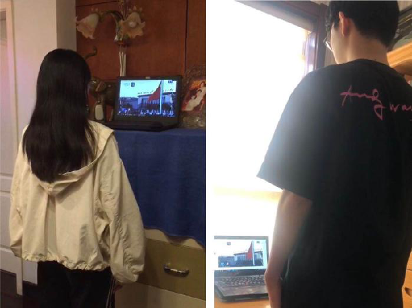 随着激昂雄壮的国歌奏响,五星红旗冉冉升起,同学们庄严肃立,隔空向国旗行注目礼。在这场一场特殊的升旗仪式里,距离并不影响同学们对国旗的敬畏、对祖国的热爱。每位同学都能感受到这一份庄严与神圣,“云升旗”依旧振奋人心。