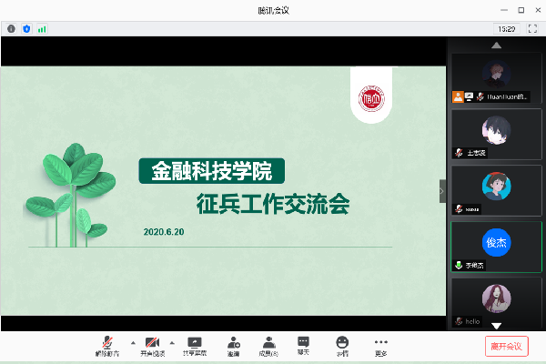 金融科技学院根据国家和学校的要求,有序推动征兵工作的进行。为确保预征兵体检同学返校期间校内生活的安全有序,6月20日,学院副书记、副院长李俊杰召开线上交流会,代表学院关心和问候同学们的情况,帮助同学们解决实际问题。学院学工团队和5名预征兵同学参与本次会议。