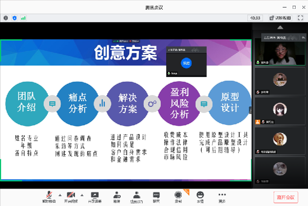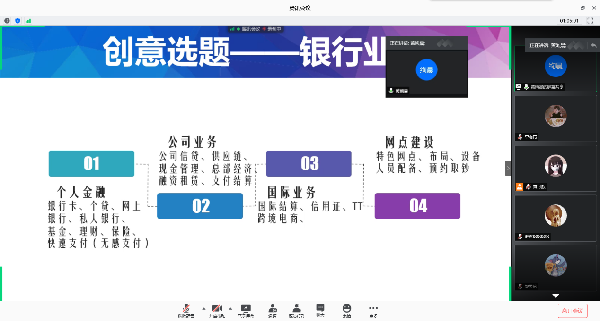 此外,黄绚晨老师认为创新方案包含团队介绍、痛点分析、解决方案、盈利风险分析及原型设计等几个方面;建议同学们关注行业热点、国家政策和银行业务等方面问题,并着重从金融科技的角度深入思考,如区块链金融应用、人工智能、计算机技术、物联网技术等,从中确定选题方向。