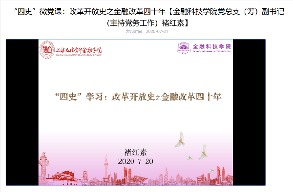目前,易班优课已推出金融科技学院党总支(筹)副书记(主持党务工作)褚红素,教师党支部书记、“双带头人”教师工作室负责人吴慧分别主讲的《改革开放史之金融改革四十年》和《从浦东开发陈列馆出发》两堂微党课,引发全院师生线上热议,反响良好。