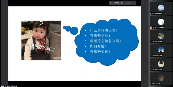 为了提高学院学生文献检索和论文写作的能力,促进学生对科研论文写作有更系统的认知。4月6号,学院菁才双创培训班组织学术论文写作培训线上培训活动。在疫情之下,本次培训由丁雪老师通过线上腾讯会议的方式进行,“菁才班”全体成员参加。