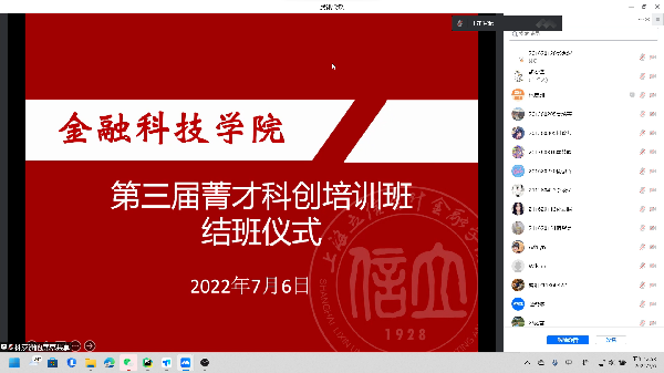 近期,金融科技学院举办了第三届菁才科创培训班线上结业仪式,金融科技学院院长殷林森、学院副书记、副院长李俊杰、指导教师楚晓琳、团委书记朱亚楠以及本届培训班学员共同参加。