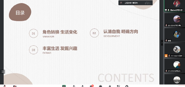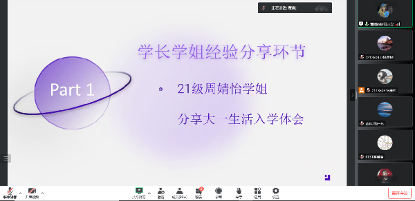 首先,21级周婧怡学姐为新生介绍大学生活。周学姐从角色转化,人生目标以及兴趣培养三个方面展开分享。学姐先讲述了课程、学习及生活上变化,建议新生调整进入学后的心态。然后,从个人学习经历出发,给到“认清自我,明确方向”的建议。最后,她就个人兴趣,倡导新生积极参与学院社团,在社团中发现志同道合的同学,感受大学生活的乐趣。