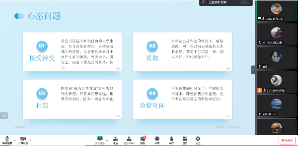 19级张淼学姐从“心态,实践,学习,实习”四个角度,分析了立信新生应当具备的品质。学姐以一个普通学生的角度,详细的探讨了四个问题,尤其强调了“心态”在大学生活中的重要性。作为曾经的大一新生,学姐倡导同学应当具备勇敢的心态,勇于克服困难。此外张淼学姐还着重强调学习英语和python语言的重要性,凸显金科新生的学科特色以及市场需求。