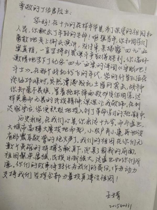 活动三 三等奖书信作品《给丁佑君烈士的一封信 》 王婧 201540331
