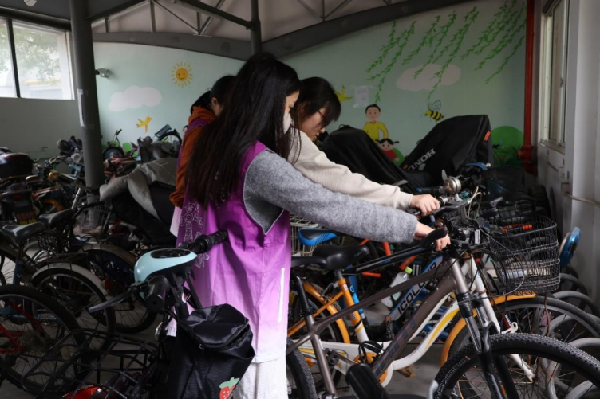 图3“小菁卫”们在整理乱摆乱放的自行车