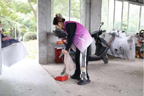在小区里,“小菁卫”志愿者们身披紫马甲,拿着钳子、垃圾桶等清洁工具,化身寻找问题的“啄木鸟”,沿着小区主干道和绿化带进行地毯式的清扫,他们分工明确、团结协作,不怕脏、不怕累,不仅清扫了小区道路旁、草坪里的杂草和垃圾,更是对小区内非机动车乱停乱放现象进行了整治。
