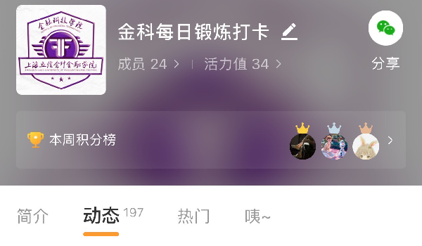 由金融科技学院团委学生会体育部举办的“金科锻炼排位赛”居家锻炼打卡活动”在金科每日锻炼打卡圈中如火如荼开展,金科学子们积极参与每日锻炼打卡,自2020年3月29日起持续七十余天至今就告一段落了,几十天内共发出了近200条打卡动态。