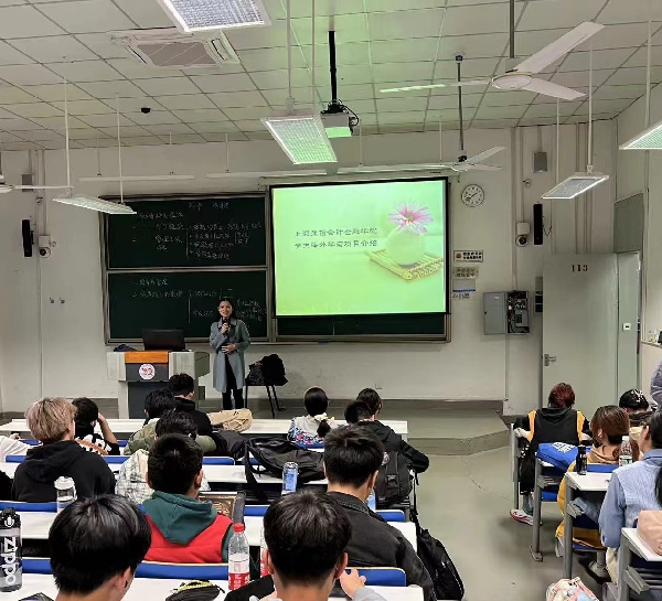 严丹老师介绍了我校国交处开展的长短学期国际交流项目。她分别从我校的境外合作院校、访学生项目、国际交换生报名要求和如何网上报名参加海外访学项目等方面为同学们进行答疑解惑,并有针对性地提出了适合不同学生的访学方案和建设性意见,为我校培养国际化人才和促进校际间合作做了精彩指导。