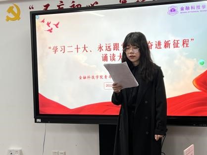 为进一步学习宣传贯彻党的二十大精神,使同学们了解党和国家的前进方向,以昂扬姿态紧跟党奋进新征程。10月26日上午,金融科技学院青马研分会以线上线下相结合的方式开展了“学习二十大、永远跟党走、奋进新征程”党的二十大报告诵读大赛。金融科技学院党总支书记凌慧义,副书记、副院长(挂职)沈丹,专职组织员陶敏,院团委书记朱亚楠,院青马研分会指导老师、辅导员卢庚宿担任本次大赛评委。学院学生党员、入党积极分子及全体青马研分会成员积极参与。