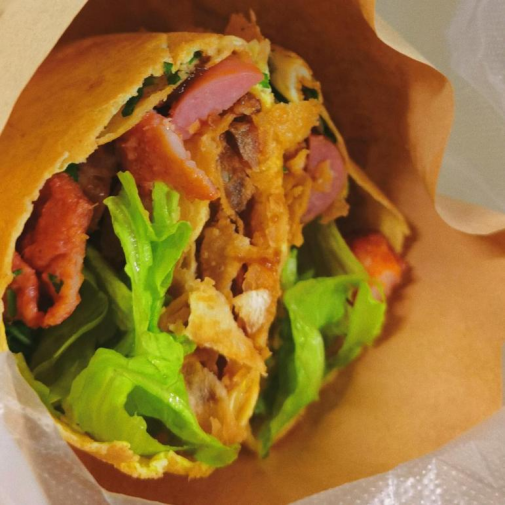 山东杂粮煎饼,煎饼劲道脆香,出餐快速,可以自主添加火腿,芝士等配菜,食堂师傅会贴心询问口味需求,满足个人的不同喜好。早起去实习工作的你是否需要这一份爱心满满的早餐呢?